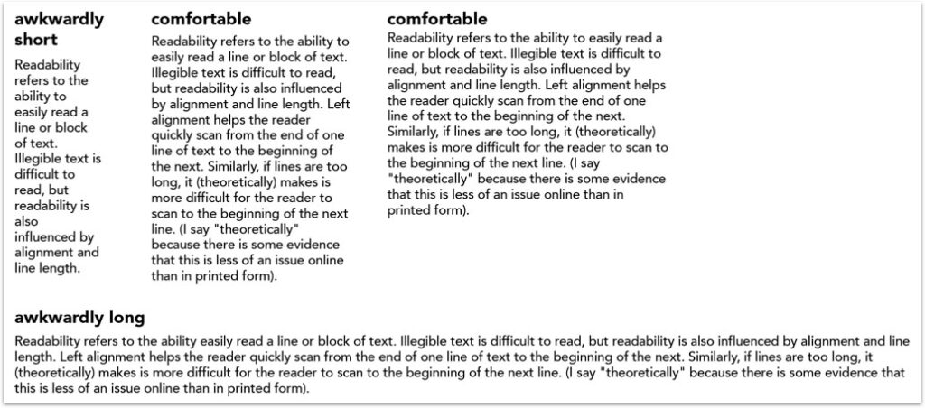 确定某项内容易于阅读的另一个因素是行长。如果行太短,并且阅读器不断在行与行之间跳动,则阅读器很难吸收信息。如果线长太长,也会发生同样的情况-眼睛很快就会疲劳。